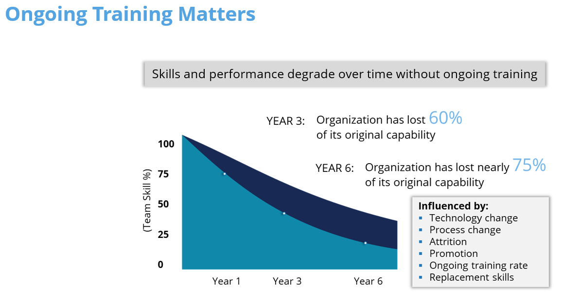 Reasons for this degradation include rapid technology changes, process changes, job promotions and the need for replacement skills.